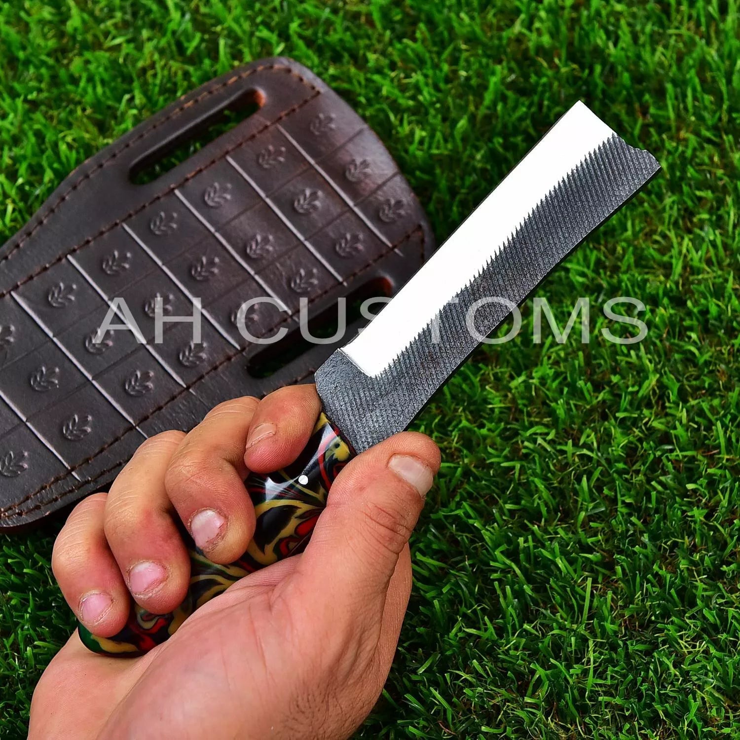 This awesome bull cutter knife is hand made by Maker. Rael steel blade is a sharp edge with its strong material.Thickness of the blade can be observed by looking at the spine which is 4 mm thick. its shape,size and all angles involved are outstanding. The handle is example of great combination in the knife collection, Handle is made of RESIN